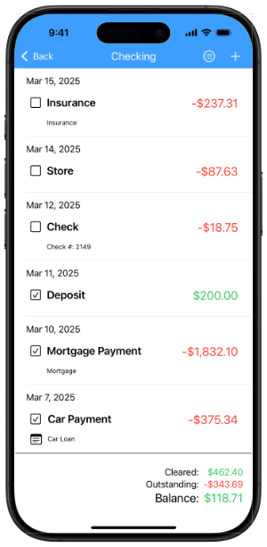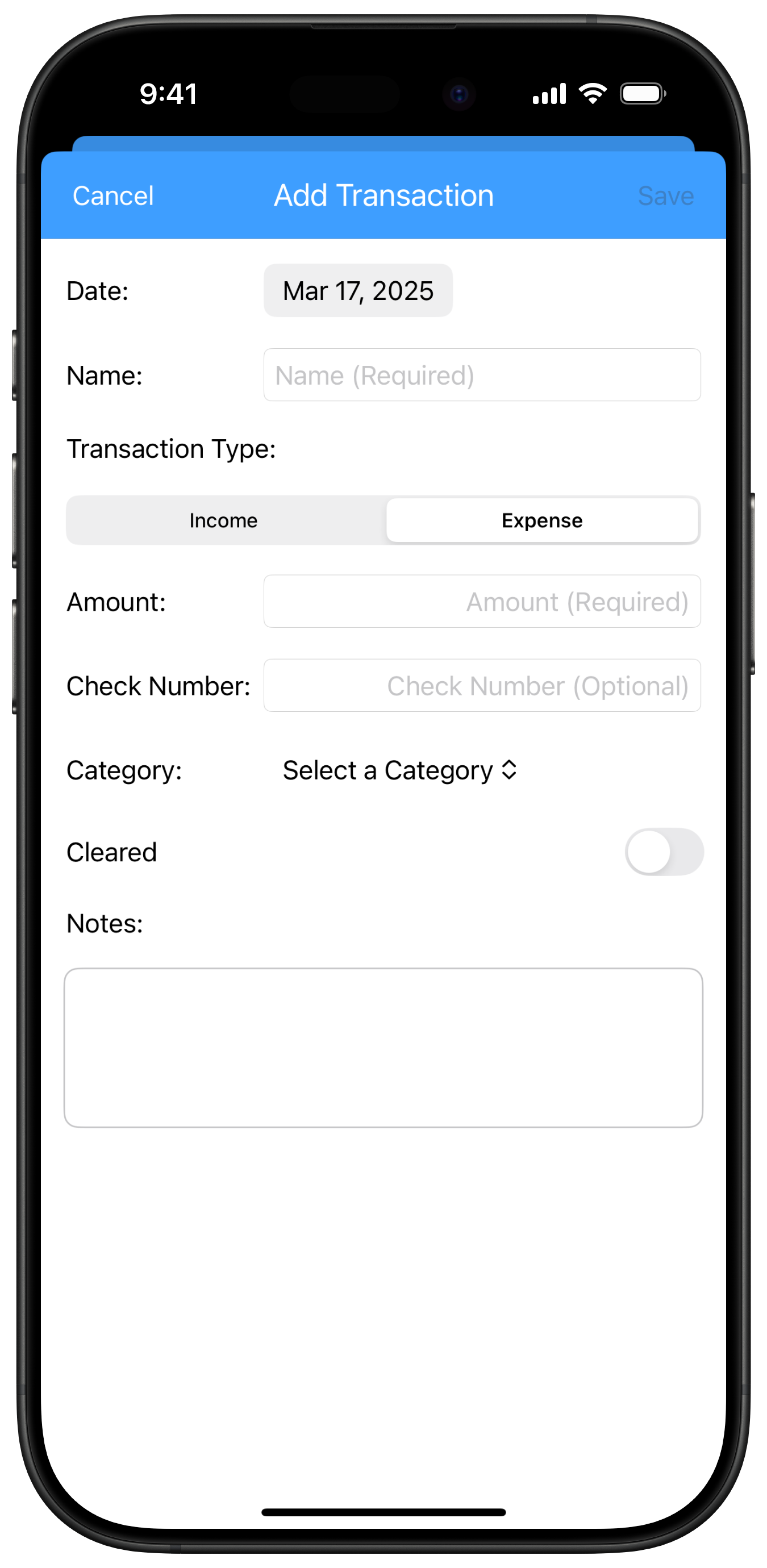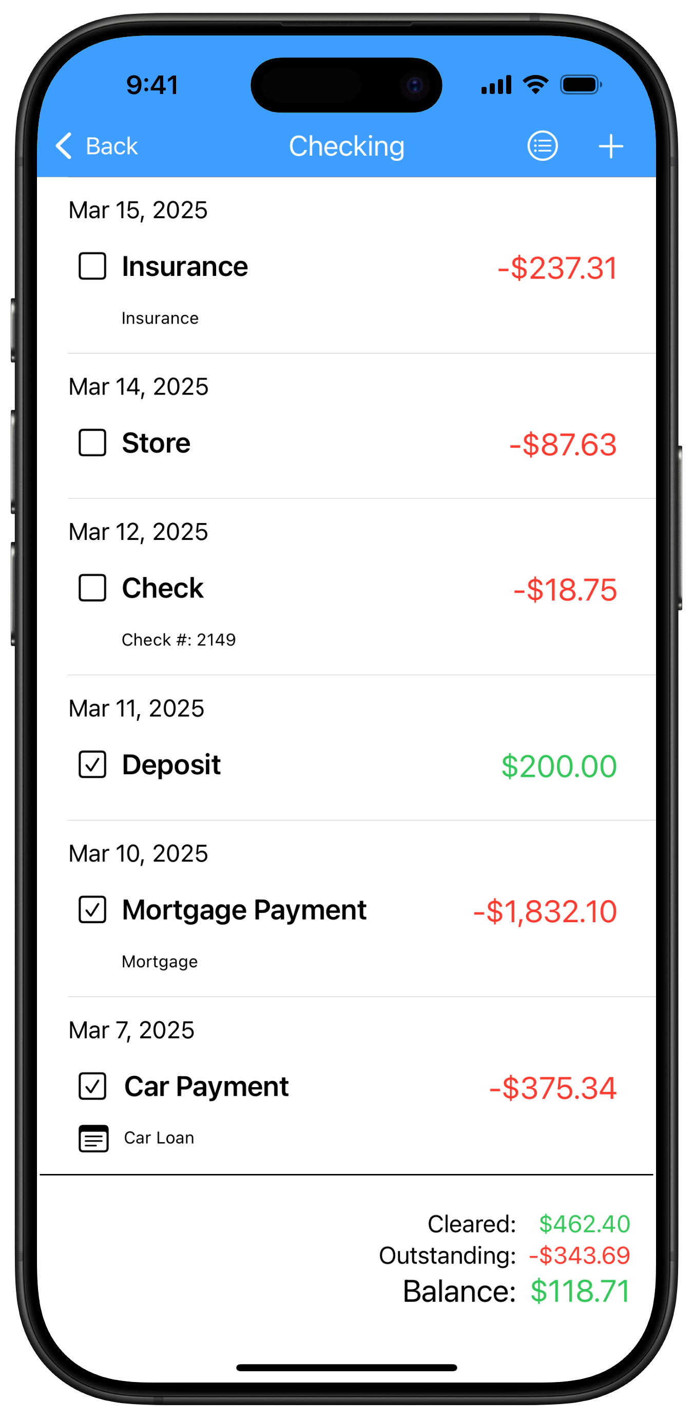 For each transaction, track the date, name, type, amount, check number, category, and notes.