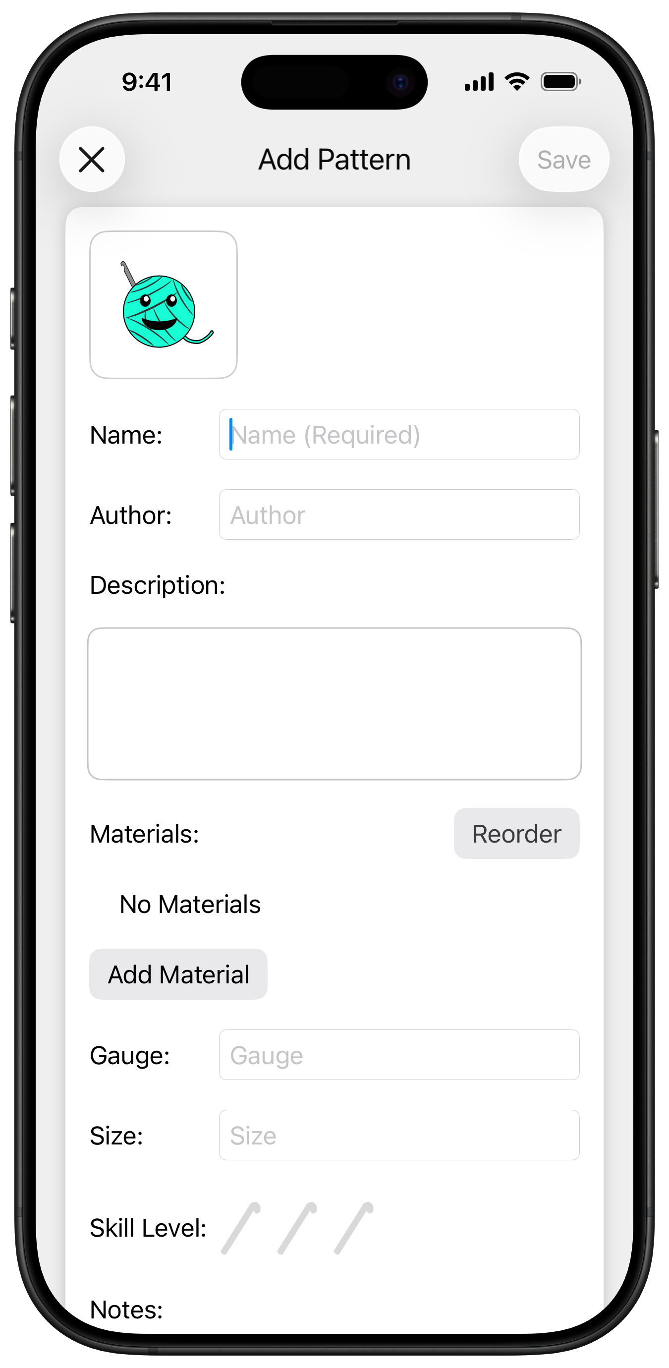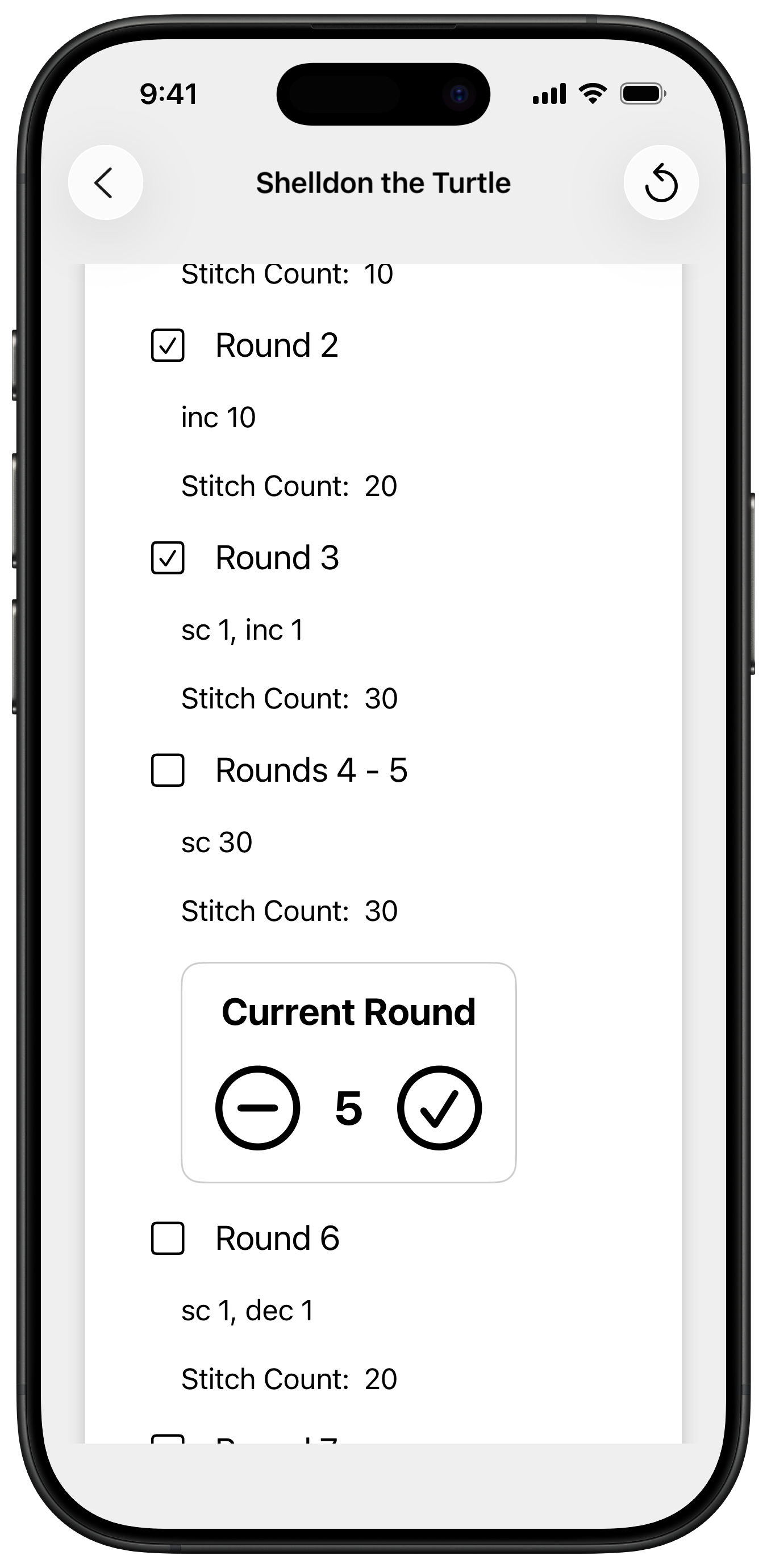 Keep track of progress, including current row/round, when working on a pattern.