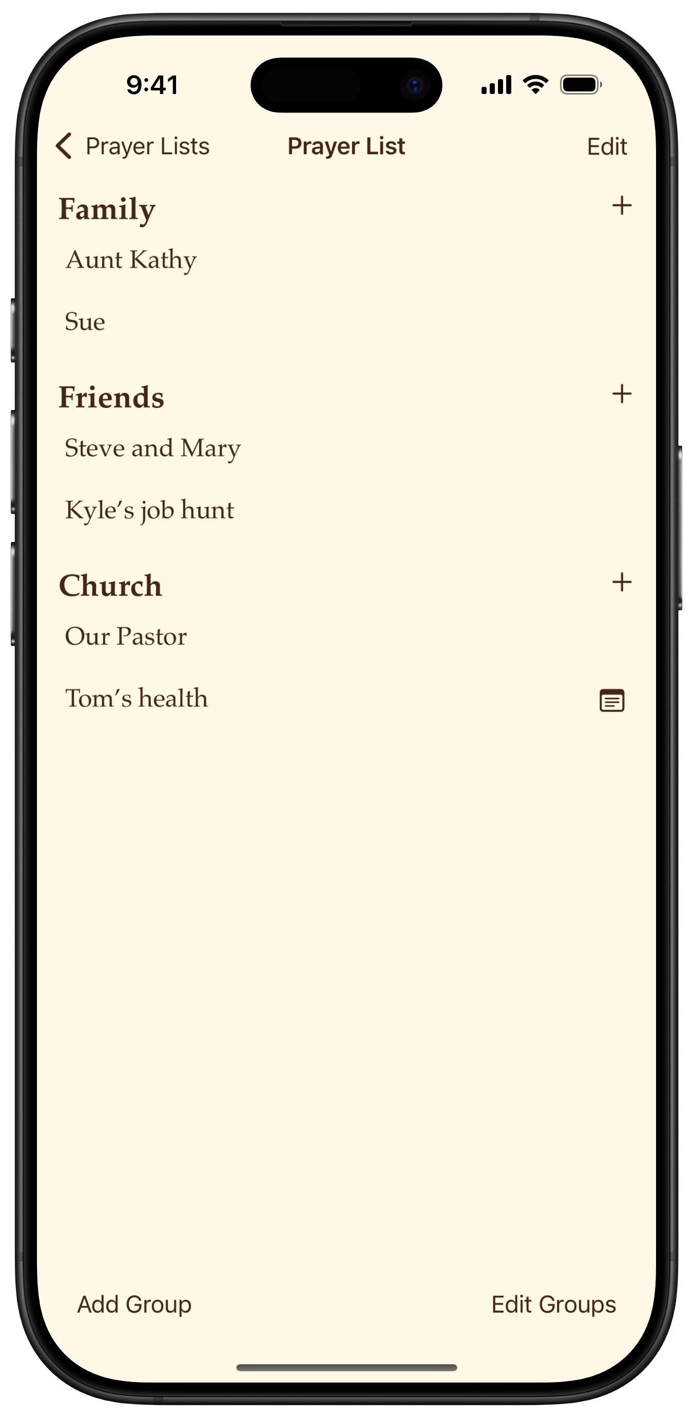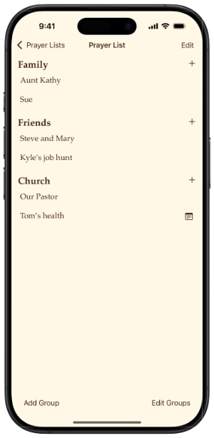 Add as many prayer lists as you like, and even include a password for sensitive items.