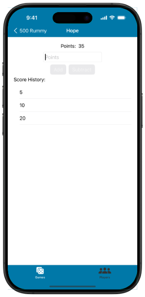 Add or subtract points for a player, and view score history.